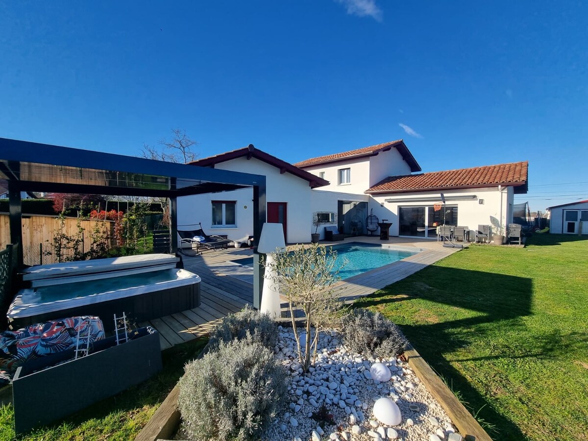 Alojamiento de lujo de una sola planta completamente renovado en 2021 en una urbanización muy tranquila, Ubicación geográfica ideal: 5 minutos del pueblo y de todos los servicios, 10 minutos del centro de Bayona y de las playas de las Landas, 30 minutos de España. ¡Su anfitrión es un conductor privado y puede llamar a sus servicios si lo desea!