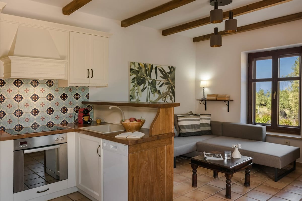 Ubicada entre olivos, nuestra moderna villa de piedra está a solo 5 minutos en coche del pintoresco pueblo de Agios Nikolaos y a 300 metros de la playa. Con 5 dormitorios (2 con baño privado), 4 baños y un inodoro, se adapta cómodamente a las familias. Todas las habitaciones cuentan con balcones, mientras que la cocina totalmente equipada y la amplia mesa de comedor para 10 personas. Disfruta de opciones de calefacción y refrigeración, un gran estacionamiento y una acogedora mezcla de diseño moderno y tradicional. ¡Tu retiro perfecto te espera!