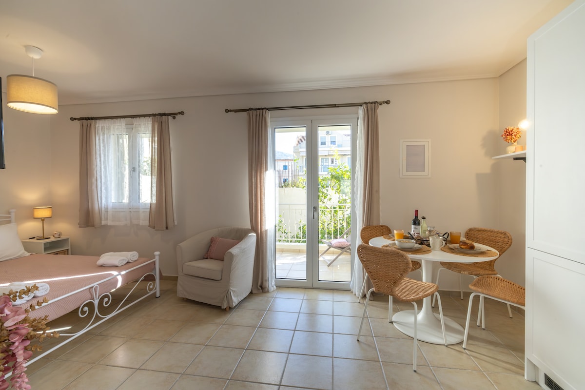 Nuestro apartamento recientemente renovado está situado en la planta baja de nuestra casa unifamiliar en Argostoli, en una zona tranquila, a solo 500 metros de la plaza principal. Tiene 25 m2, tiene una pequeña cocina separada con todas las comodidades. baño con una gran ducha, lavadora, televisión inteligente y fantásticas vistas al mar y a la ciudad. Las vistas se proporcionan tanto dentro del dormitorio con una ventana muy grande, como también desde nuestra terraza privada sombreada. Hay aparcamiento gratuito disponible en la tranquila vía pública.