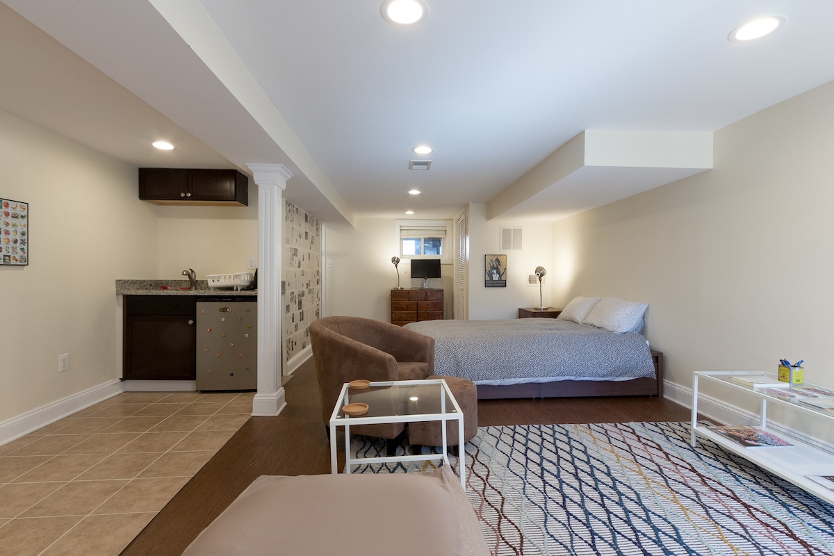 Relájate en este acogedor estudio en Arlington, Virginia. Disfruta de la comodidad de estar cerca de DC mientras te relajas en la tranquilidad de Arlington. A menos de 10 minutos del aeropuerto Ronald Reagan y del National Mall. A solo 2 minutos en coche de tiendas de comestibles y farmacias cercanas, así como de los mejores lugares para comer. Este espacio está apilado para satisfacer sus necesidades de descanso. Wifi gratis y Smart TV de 50". El café te está llamando. Juegos y un rompecabezas esperan a que juegues. ¡Diviértete! NO SE ADMITEN MASCOTAS. APARCAMIENTO EN LA CALLE (generalmente fácil de encontrar)