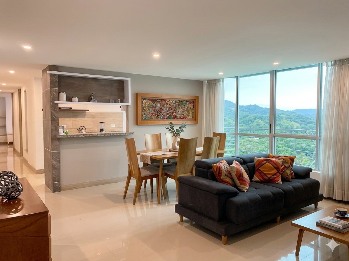Disfruta un apartamento moderno y cómodo con vistas impresionantes a la ciudad y Cordillera Central. Clasificado dentro del 5% de los alojamientos mejor valorados en Armenia. Ubicación privilegiada: a 5 min del C.C. Portal Quindío y Centro de Convenciones, con restaurantes, supermercados, parques, farmacias, cafés y bares a pocos pasos. A 15 min de Circasia; 30–40 min de Salento, Valle del Cocora y Filandia; y 45 min del Parque del Café, Panaca y Pereira.