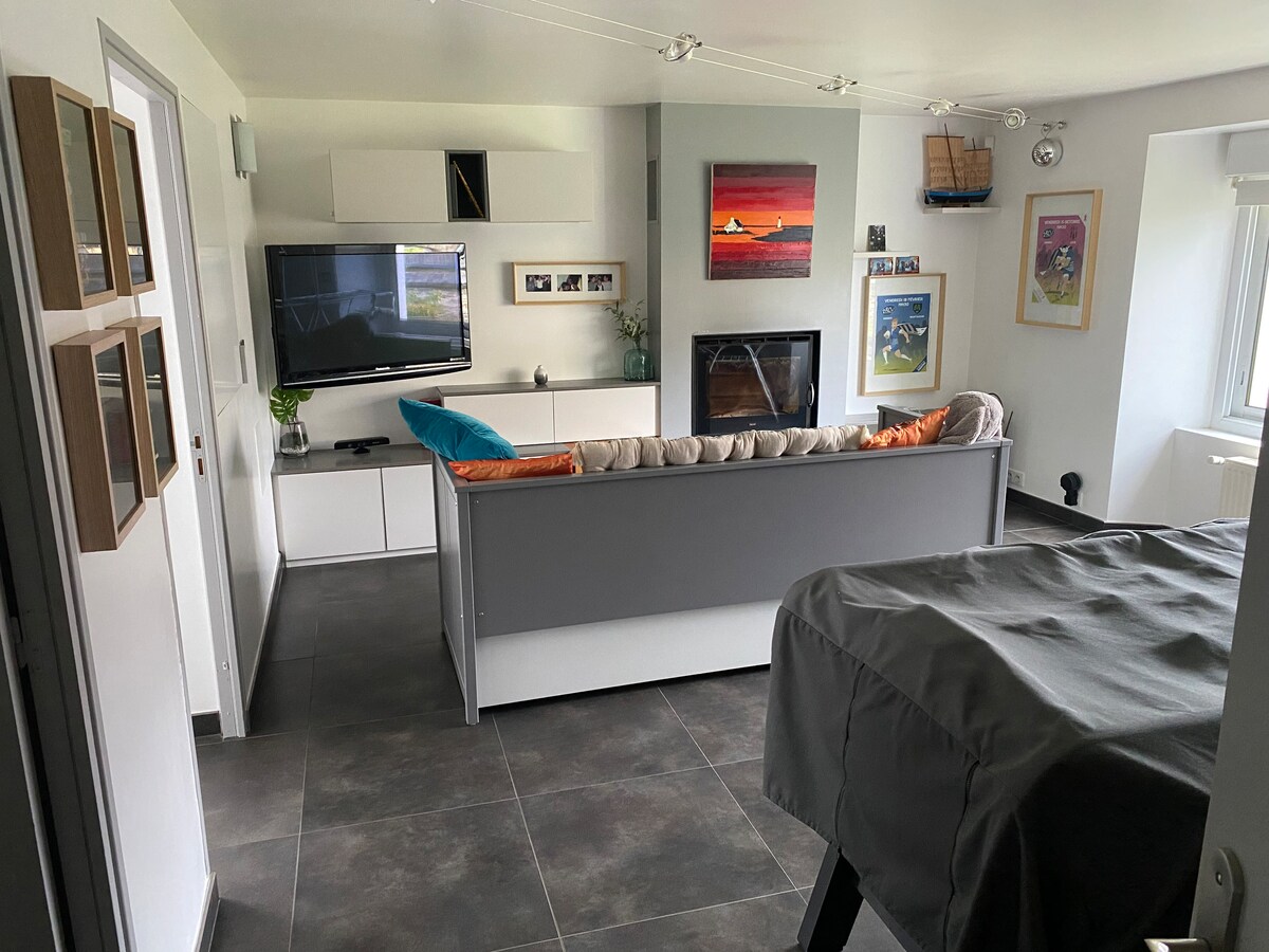 Hola y bienvenido a bordo de este bonito estudio abuhardillado, situado en el último piso de esta hermosa casa de Carnac de 1939 «Ti Melen». Con una ubicación ideal entre playas y megalitos. Una vez que se haya instalado, su temática dejará navegar su imaginación, prolongando así su experiencia de nuestra hermosa región. Estaremos encantados de compartir nuestros favoritos (restaurantes, tiendas, paseos…). No dude en ponerse en contacto con nosotros para preparar su estancia. Hasta pronto. Valérie y Luc.