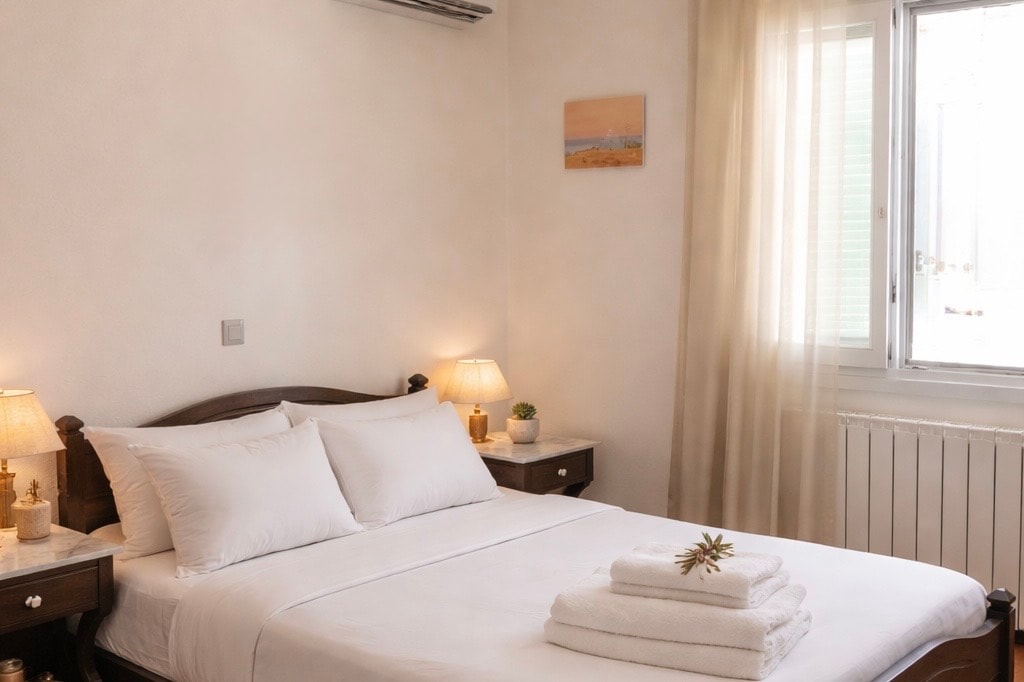 The apartment is located about 500 meters away from the port, 40 meters away from the nearest bus stop and 70 meters away from our blue flag awarded beach. You will have a fully equipped kitchen at your disposal with a fridge, an oven, a toaster, a coffee pot and kitchenware. There is a mini tv and an AC Unit in the bedroom. You will also have shared wi-fi and first-floors' balcony access. Ask for recommendations. (2021 extras) An armchair with vibrations. A small collection of board games.