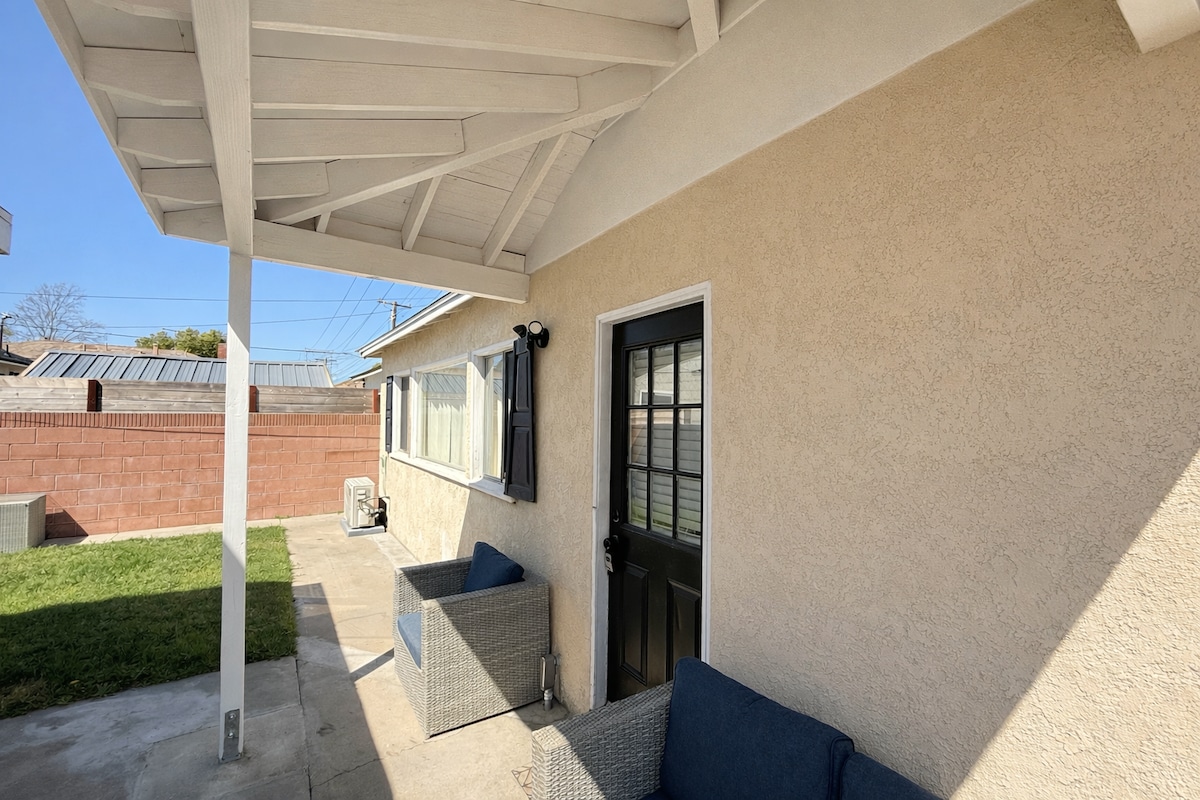 Una suite interior recientemente renovada, completa con una entrada privada, baño completo, cocina americana, cama de tamaño completo y un patio privado con parrilla. También hay un futón que se despliega en una cama de tamaño completo para que pueda dormir fácilmente 4 personas. Está convenientemente ubicado a poca distancia en coche del aeropuerto y de muchas atracciones del sur de California. Aeropuerto de LAX 22 millas Aeropuerto del Condado de Orange 23 millas Disneyland 11 millas Knott 's Berry Farm 6 millas Playa más cercana 13 millas Estacionamiento disponible en el camino de entrada