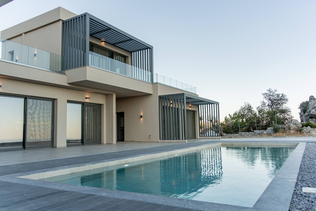 Welcome to your dream villa, built in contact with a rock formation! This residence offers two bedrooms with private en-suite bathrooms. (1 with extra sofa bed) The villa is situated on an 6000m2 plot filled with pine trees and olive groves. Several steps lead down to your secluded beach.The kitchen and the dining room in the aithrio feature panoramic sea views.The outdoor spaces of 120 m2 include a sitting area protected by a shading pergola,sun loungers an outdoor dining place,barbeque, shower