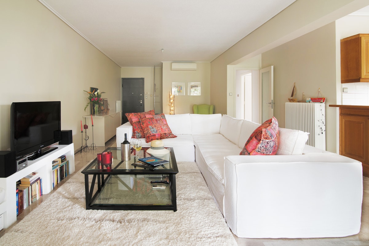 A very spacious,minimal,modern 100 square metres apartment on the first floor on a quiet and very safe neighbourhood just a five minute walk from the Athenian coastline.Two bedrooms, one equipped with a Queen size bed and the other with a double bed both rooms with a seperate balcony.The living room is very spacious and has an incredibly comfortable sofa that also serves as a single bed.The bathroom and WC have just been renovated.The kitchen is modern and fully equipped.