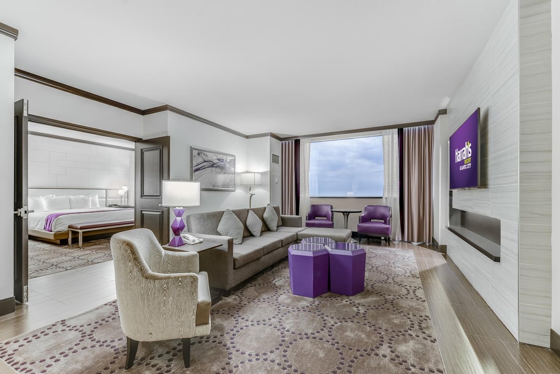 La Bayview Tower Junior Suite en Harrah's Resort Atlantic City es un estudio clásico con encanto de Atlantic City. La sala de estar separada cuenta con un cómodo sofá, sillones lujosos, tocador para huéspedes, área de trabajo dedicada y ventanas extragrandes que dan a las inspiradoras vistas de la bahía de Absecon para mayor relajación. El dormitorio cuenta con una cama tamaño king y cortinas opacas para garantizar una noche completa de sueño profundo. Un baño bien equipado también adorna la suite con una combinación tradicional de ducha y bañera, una expansión