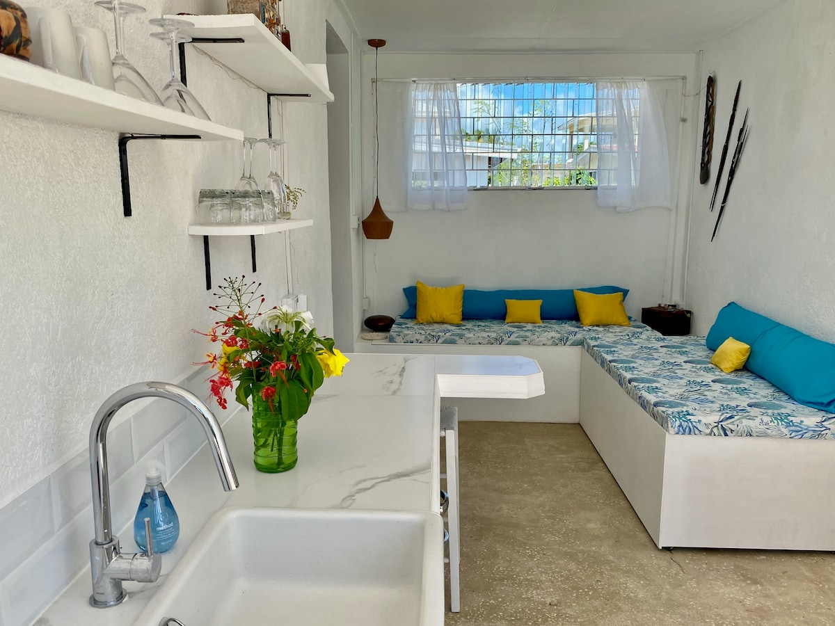 ¿Necesitas una escapada a la playa de Barbados? Ven a alojarte en nuestro apartamento junto a la playa Chill a Bit en Oistins y relájate mientras te balanceas suavemente en nuestra hamaca mientras te mecen los tranquilos vientos del océano. Chill a Bit es un estudio independiente, brillantemente compacto, situado directamente en la playa. ¡Sal por la puerta trasera y sumerge los dedos de los pies en el agua en cuestión de segundos! Nos enorgullecemos de nuestro servicio de 5 estrellas. Si tienes alguna pregunta sobre nuestro apartamento o sobre qué hacer durante tu estancia en Barbados, ¡pregúntanos!