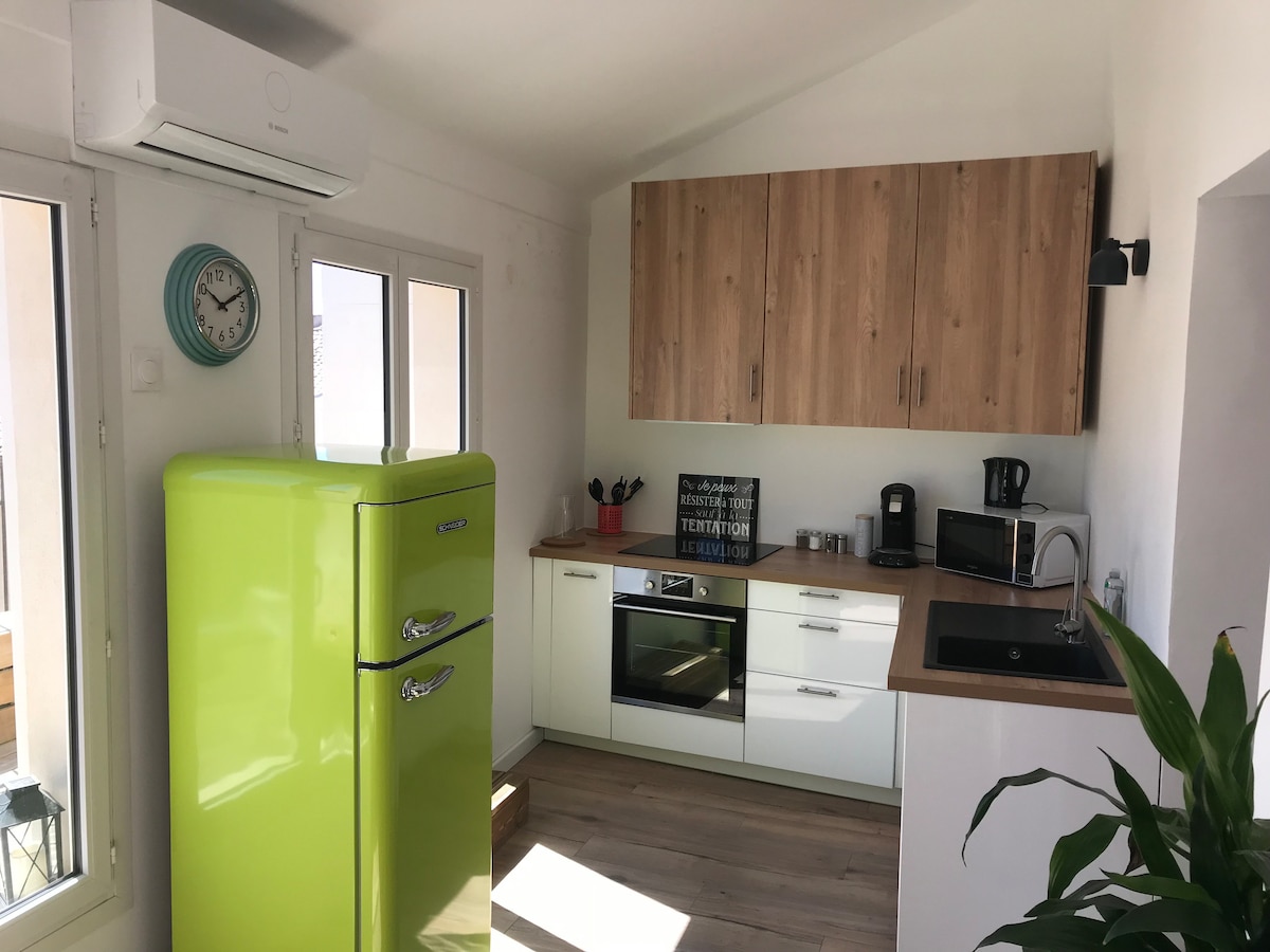 El apartamento orientado al sur, luminoso y tranquilo tiene un dormitorio sencillo pero agradable, una cocina abierta al salón y un pequeño cuarto de baño. Situado en el campo, pero a un kilómetro del centro de la ciudad, un pequeño autobús gratis en frente de la casa sirve al centro de la ciudad de Aubagne. El apartamento también se encuentra a quince minutos del mar, posibilidad de llegar en autobús. Hay una ubicación para un automóvil disponible en el jardín.