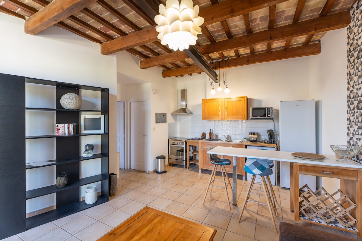 Idealmente situado en las murallas peatonales del típico pueblo provenzal de Aubignan, su alojamiento independiente de 25 m2 es el punto de partida de destinos variados, culturales, gustativos o deportivos ... Todas las tiendas a poca distancia: supermercado, panadería, restaurante, bodega... Usted ocupa la planta baja, de una casa provenzal del siglo XVIII con vigas de madera y paredes gruesas. A la sombra de los plátanos, hace frío en verano. Cocina, dormitorio y cuarto de baño equipados cómodamente.