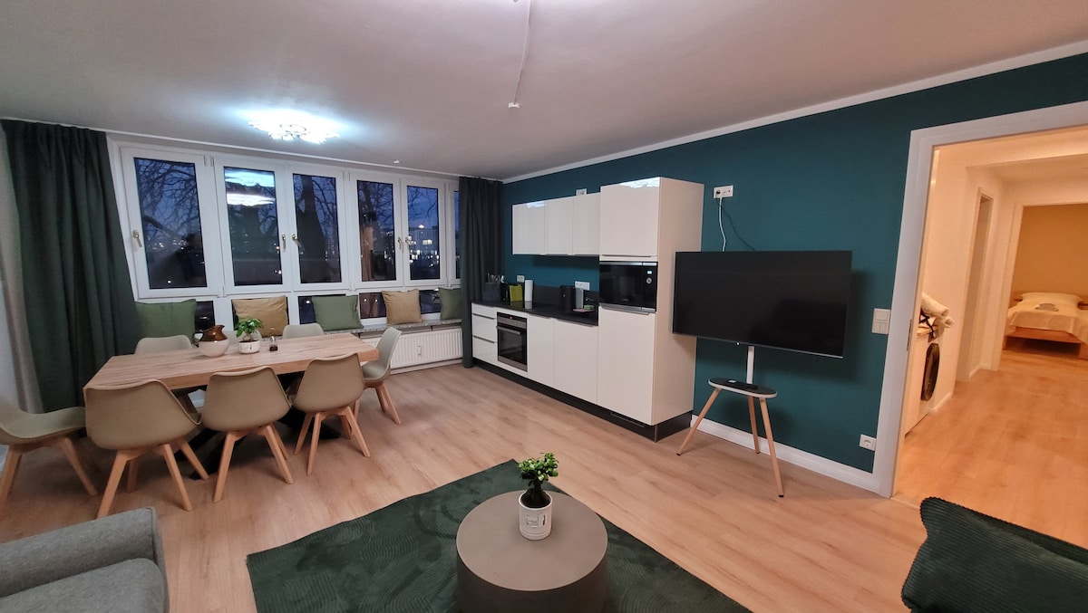 Tranquilo, luminoso, moderno y de alta calidad apartamento de 2 habitaciones (65 metros cuadrados) con un gran balcón. Desde el apartamento se puede llegar rápidamente a la autopista A94, a la carretera de circunvalación del aeropuerto y al tren de cercanías. El apartamento, decorado con buen gusto, cuenta con una cocina totalmente equipada con lavavajillas y lavadora. El gran baño con bañera de esquina y ventana es muy amplio y luminoso. El sofá se puede convertir en una cama. La conexión wifi está disponible de forma gratuita.