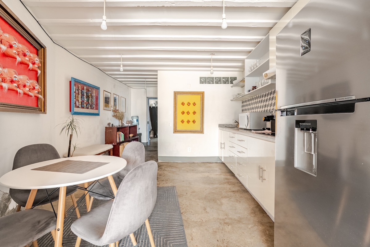 Un súper acogedor loft, nuevo, funcional, que además de proveer todo lo necesario, cuenta con áreas comunes en las que puedes disfrutar de una tarde en la estancia con chimenea y piano, o una mañana soleada ejercitándote en el canal de nado a contraflujo y gym, disfrutando después del roof garden. Puedes hacer uso igualmente de la cocina común y de lavadora y secadora. Monta la bicicleta y recorre las calles de Coyoacán, un ¨must see¨de la ciudad. A 5 minutos a pie del metro General Anaya.