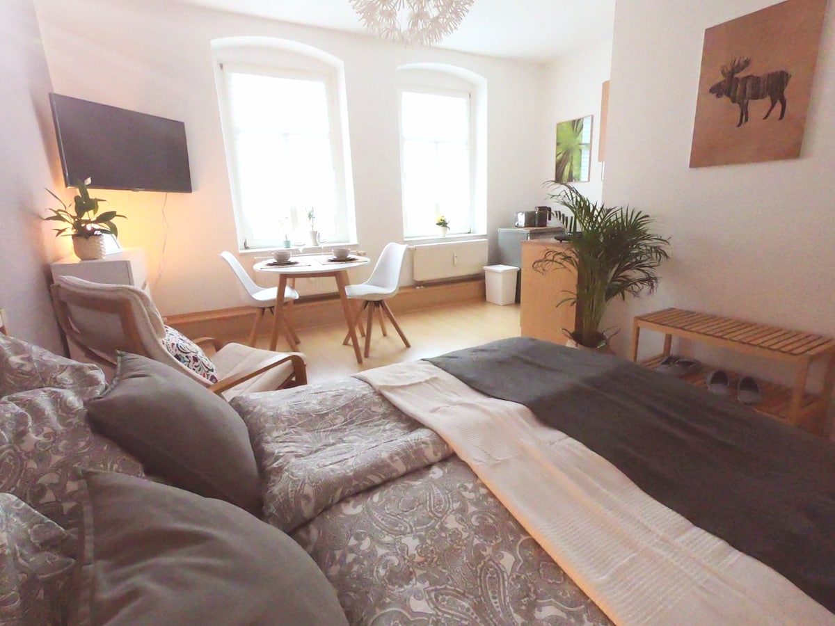 Estimado futuro, querido futuro huésped: en una de las mejores ubicaciones de Chemnitz, equipada con parque o estanque del castillo, que también te invita a hermosos paseos, a 15 minutos del centro de la ciudad se encuentra mi acogedor y económico alojamiento. Desde la estación central se encuentra a 20 minutos a pie o en autobús (línea 21) directamente a 100 m de mi puerta principal. El departamento ofrece un hermoso balcón, baño con bañera, cama de 1,80 y una pequeña cocina con cafetera. ¡Hasta pronto!