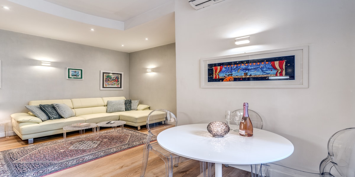 Toma un baño de luz romana en este luminoso apartamento, alegre y colorido, con muebles de diseño y una pequeña terraza que recorre toda la casa para uso exclusivo. La luz es, sin duda, el elemento que distingue a esta casa, que se encuentra en el quinto piso de un edificio antiguo y cuenta con una pequeña terraza a lo largo de toda la casa donde se puede desayunar con tranquilidad para disfrutar de una buena copa de vino italiano después de un buen día recorriendo las antiguas calles de la «ciudad eterna».