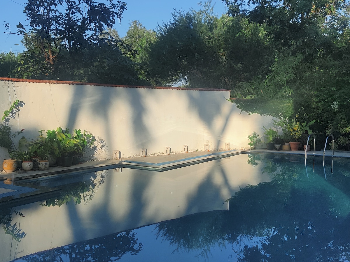 Esta es una gran villa llena de hermosos muebles antiguos y pinturas en las paredes para admirar. Hay mucha luz solar y aire. 3 dormitorios grandes con aire acondicionado y baños adjuntos. Cena en el interior y al aire libre. Sala de estar. Excelentes vistas de los árboles y un estanque de loto. Una gran piscina limpia. Servimos todas las comidas. Jardín. Juegos de interior, altavoces bluetooth. Lee, descansa, sueña aquí A 7 minutos a pie de la prístina playa de Awas. A 10 minutos en coche del embarcadero de Mandwa. Conduce desde Pune o Mumbai.