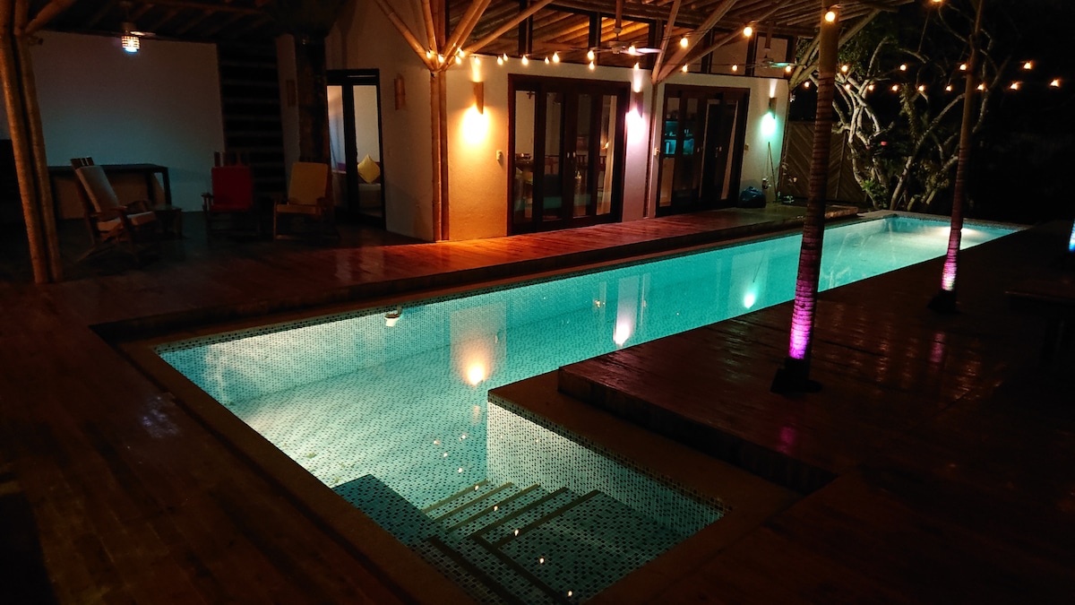 The Casita De Bambu is a COZY CABIN in a hidden oasis with a POOL in the heart of Ayampe--just 3 blocks to the best SURFING BEACH & sleeps up to 6 people! -PRIVACY in a cabin with TALL TREES; -cook delicious meals in indoor and outdoor KITCHENS + BBQ; -family-friendly POOL with shallow play/tanning area; -LOUNGE about or do YOGA under the PERGOLA; -enjoy the CHILD-FRIENDLY green backyard; -SWING under shady trees. Follow on Insta @CasitaDeBambu. Bookings through Airbnb only :)