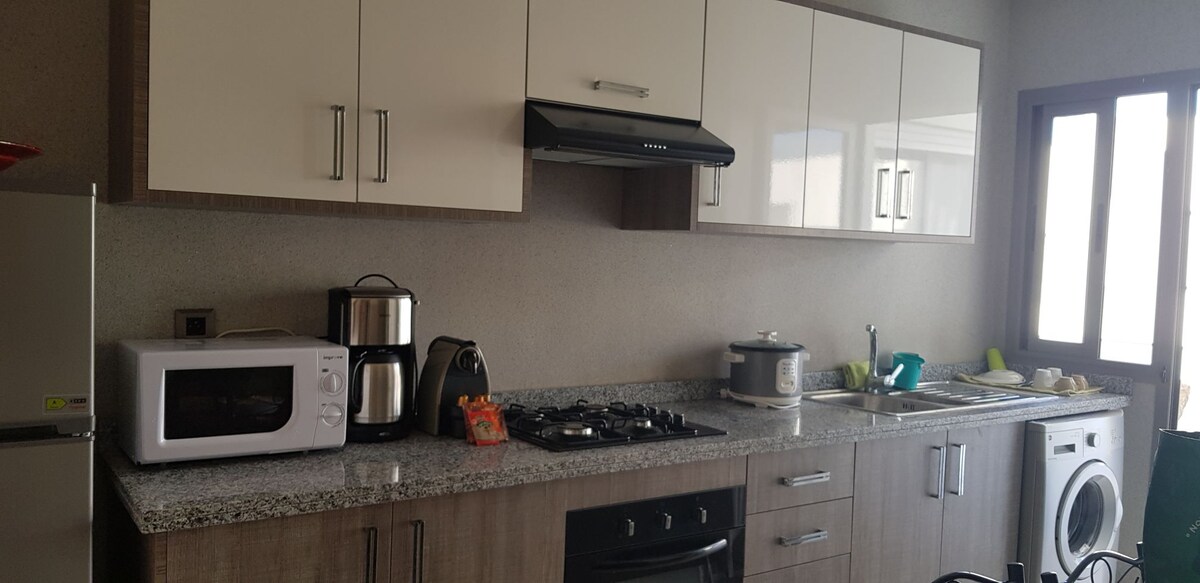 Welcome to our modern, cozy apartment where comfort meets style. Enjoy a bright living room with navy sofas, a sleek kitchen, and a dining area for six. The space includes fast WiFi, a flat-screen TV (Bein sports, IPTV service), and elegant décor. Large windows fill it with natural light and calm energy. Just 3 mins to the train station, 2 mins to Carrefour and 5min driving to the beach & City Center…(not allowed to unmarried couples) Perfect for relaxing short or long stays.