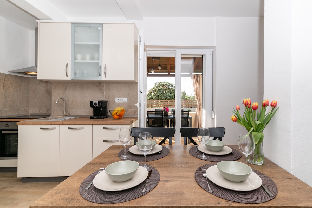Welcome to our 52 m² studio in Zadar, featuring a Mediterranean garden with olive, citrus and fig trees that provide shade and tranquility after a day of exploring. Guests are welcome to enjoy fresh seasonal vegetables and fruit from the garden. You might also spot our friendly cat, Sparky 🐾. KEY FEATURES: ✔ Free private parking ✔ AC (2 separate units) ✔ Nespresso Vertuo coffee machine ✔ Free bike rent and safe storage ✔ Easy access ✔ BBQ NOTE: The studio has a 200 cm ceiling height.