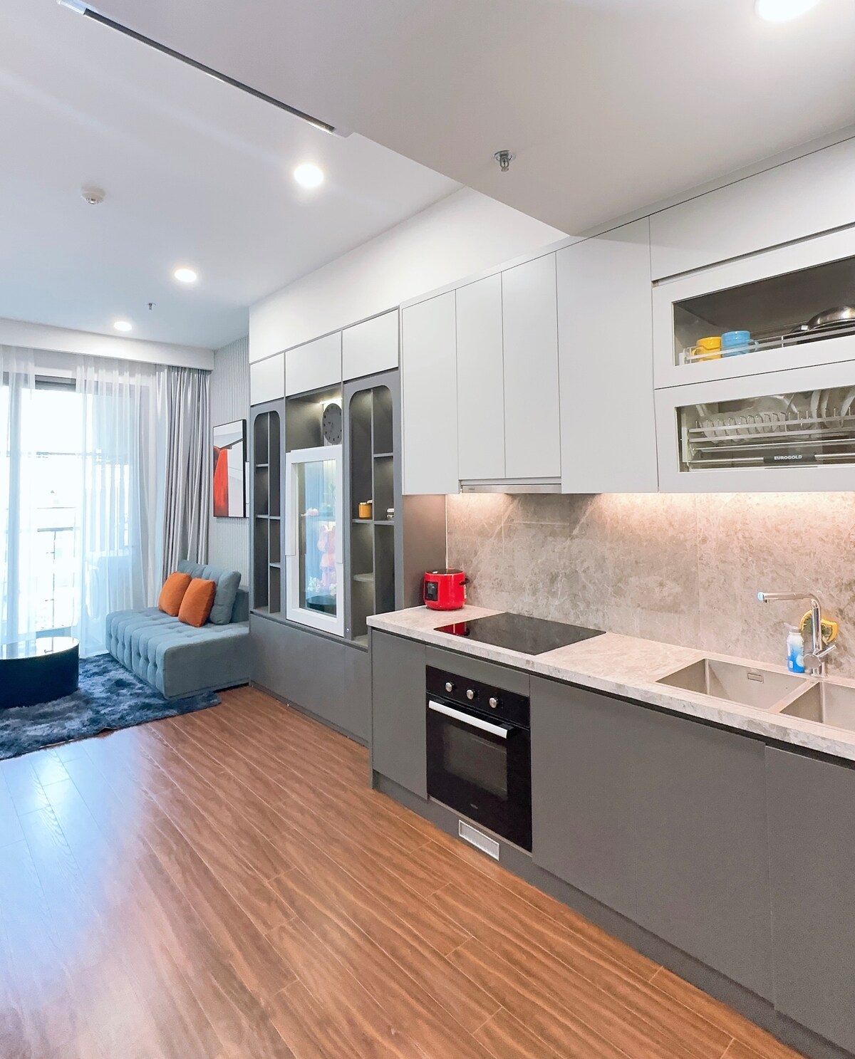 •1 dormitorio separado con una cama grande y suave. • Área “+” con cama supletoria, adecuada para familias pequeñas o grupos de amigos de 3–4 personas. • Sala de estar abierta y totalmente amueblada: TV, sofá, aire acondicionado, wifi de alta velocidad. • Cocina moderna: utensilios de cocina completos. • Inodoro limpio, con lavadora y calentador de agua. • Seguridad y recepción las 24 horas, los 7 días de la semana, seguridad absoluta. • Gimnasio de lujo, piscina interna. •Cerca del mar del lago salado, el lago central, el centro comercial Vincom Mega, la escuela, el hospital nacional