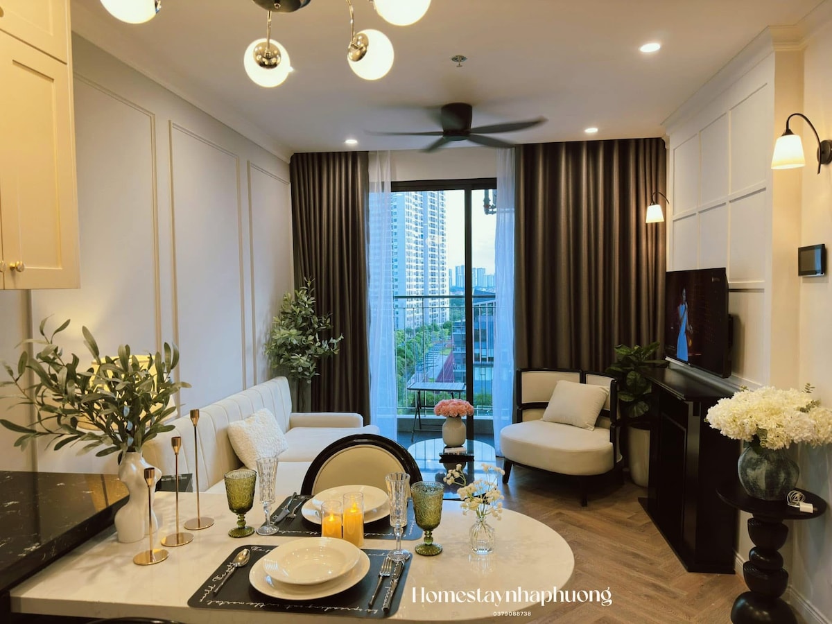 Không gian được thiết kế theo tông trắng – kem – nâu hiện đại tạo cảm giác dễ chịu ngay từ khi bước vào. Phòng khách thoáng rộng, mở ra ban công lớn với góc nhìn thành phố và khu tiện ích xanh mát. Căn hộ được trang bị đầy đủ tiện nghi: sofa êm, TV thông minh, wifi mạnh, khu bếp gọn gàng với đầy đủ dụng cụ nấu ăn và bộ bàn ăn được bày trí tinh tế. Phòng tắm có bồn tắm – điểm cộng khiến nơi đây trở thành không gian nghỉ dưỡng đúng nghĩa.