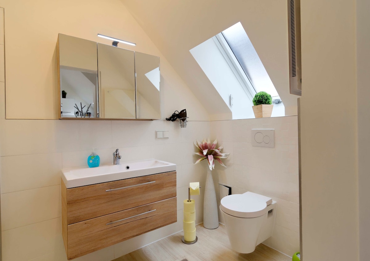 Elegante y amplio apartamento situado en una zona tranquila cerca del centro de la ciudad. Dos dormitorios, dos aseos separados, baño espacioso, cocina espaciosa y sala de estar con oriel. Está bien comunicado con el transporte público y hay aparcamiento subterráneo disponible (no apto para vehículos grandes). A poca distancia a pie de la zona comercial central y de varios parques. Disfruta de una estancia sin preocupaciones en la ciudad de Baden con excelentes conexiones de transporte al centro de Viena.