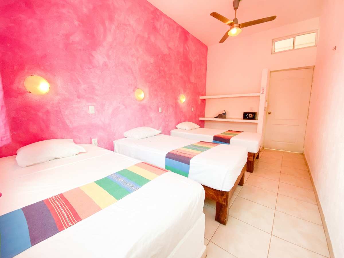 Habitación privada con baño, 3 camas y aire acondicionado en hostal