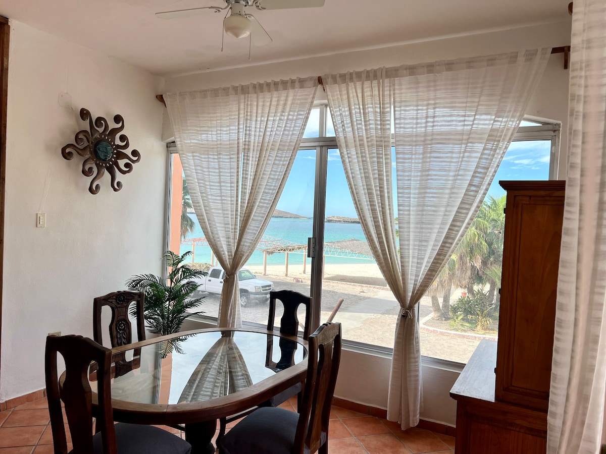 Condominio en planta baja con acceso directo a la playa y alberca en Club Hotel Cantamar, La Paz. 2 recámaras con baños privados, cocina bien equipada y estacionamiento. Ideal para una escapada de playa cómoda y conveniente. Cuenta con internet satelital Starlink propio y TV con soporte streaming.