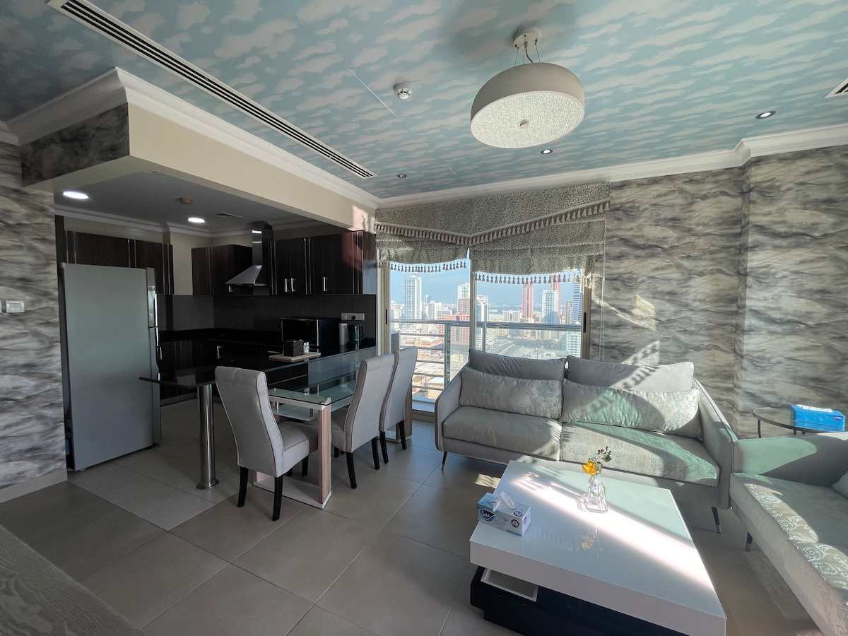 ¡Te damos la bienvenida a Juffair! Este elegante departamento con vista al mar se encuentra en Sukoon Tower, que se comparte con el Hilton Hotel Bahrain. El edificio está totalmente equipado con dos piscinas, jacuzzis, saunas, canchas de baloncesto y gimnasios. Es una opción ideal tanto para viajeros de negocios como de placer, situada cerca de centros comerciales y del centro de la ciudad. A solo 13 kilómetros del aeropuerto cercano, encontrarás una variedad de deliciosos restaurantes, cafeterías acogedoras, tiendas únicas y muchas actividades para disfrutar.