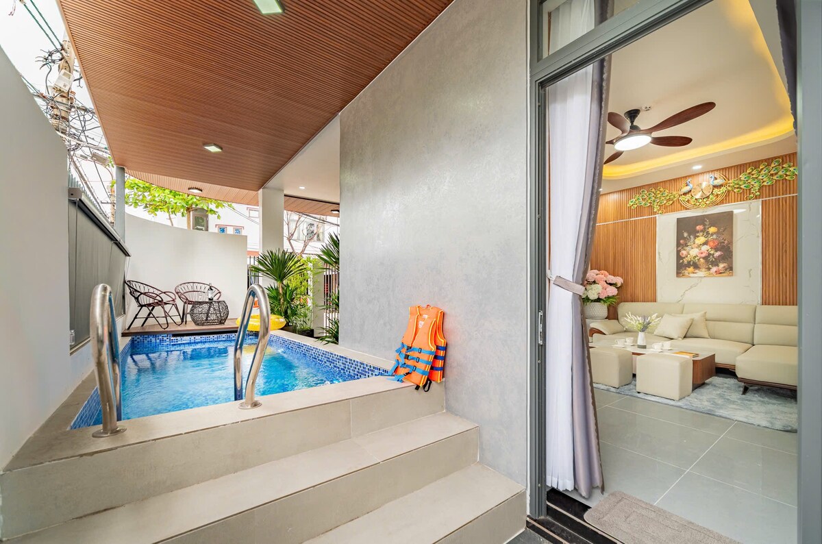 Manjula Da Nang House – Villa de 3 dormitorios, piscina privada y jacuzzi ¡BIENVENIDO A MANJULA DA NANG HOUSE! 🌊 A solo 300 metros del mar 🏡 Amplia y moderna villa de 2 plantas Amplios 🛏 3 dormitorios, 4 baños separados Bañera 🛁 relajante y sistema de hidromasaje 🏊 Piscina privada 🎥 Equipado con TV de pantalla grande + proyector – Tk Netflix 📶 Wifi de alta velocidad, totalmente amueblado. ☀️ Jardín espacioso, espacio abierto Conveniente 💧 purificador de agua pura