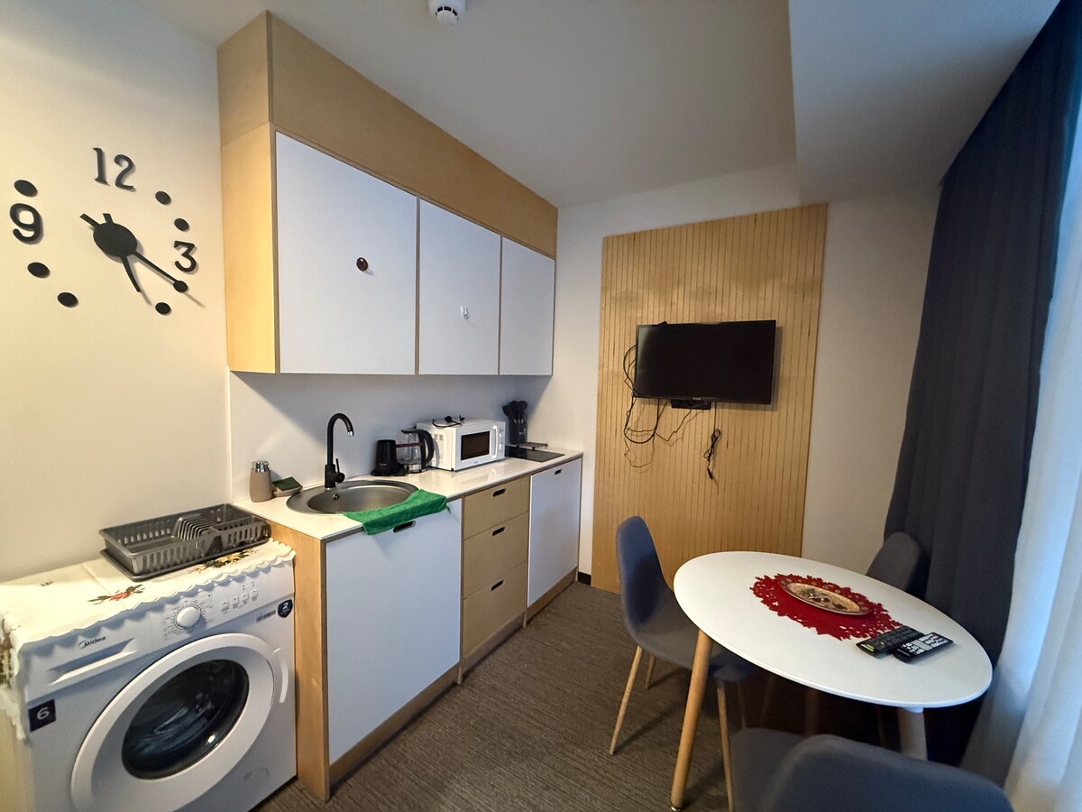 Disfrutarás de fácil acceso a todo, desde un hotel céntrico de 4 estrellas. Justo alrededor hay bonitos parques, zona forestal para el aire fresco y está a 3 minutos a pie del invierno, el mejor lugar de esquí olímpico de invierno de 2023 Didveli con teleféricos. El apartamento de 40 metros cuadrados es de estilo estudio con un gran balcón. Las camas tienen sábanas, toallas, todos los platos necesarios y una tostadora, hervidor de agua y lavadora. El piso está en el cuarto piso con una vista perfecta. La piscina está fuera de servicio temporalmente.