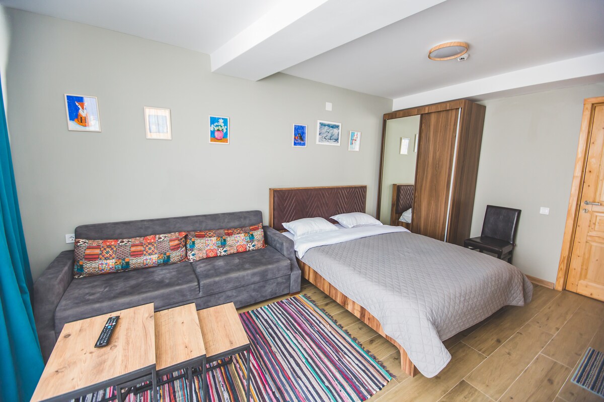 Comfortable studio type apartment, the apartment is located on the fifth floor of the Spa Resident Hotel Velly, the apartment has all the necessary conditions for a comfortable stay. The hotel is located 200 meters from the Didveli ski slope. children's entertainment room, restaurant, concierge, ski storage,