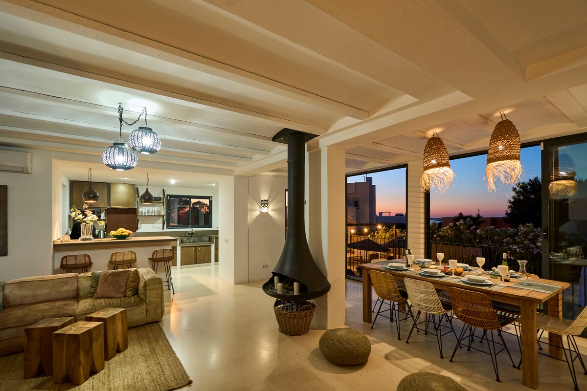 This luxurious 5-bedroom, 5-bathroom villa in Cala Vadella, Ibiza offers stunning sea and sunset views, a heated pool, and stylish interiors . Just a 5-minute walk to Cala Vadella beach with its charming bars and restaurants. Perfect for extended families and groups, it features 2 lounges, 2 kitchens, multiple chill-out areas, a garden, roof terrace, pool table, table tennis, arcade machine and baby equipment (extra children can be added) Enjoy unforgettable memories in this exquisite retreat.