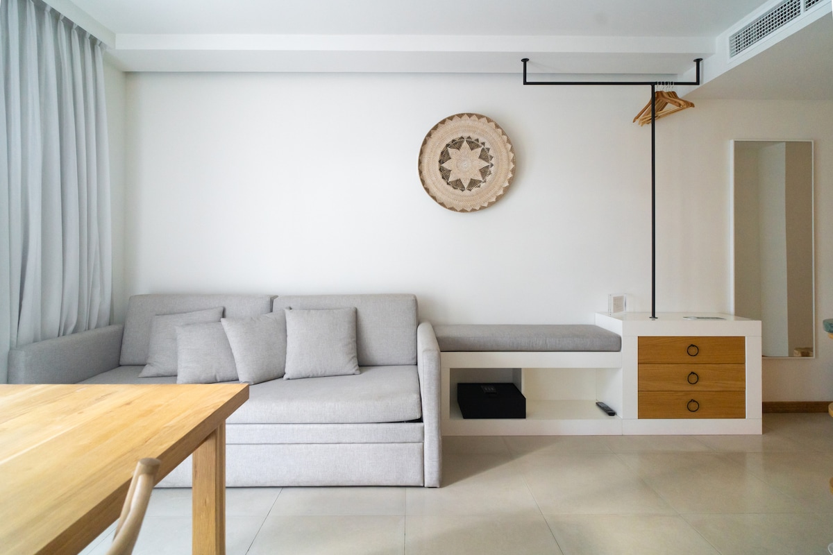 Esta suite es ideal para parejas, viajeros solos o familias pequeñas que buscan una estadía tranquila y elegante en Palma. Cuenta con un dormitorio, sala de estar, cocina completa y un balcón francés lleno de luz. La cama tamaño queen tiene sábanas orgánicas de primera calidad y el sofá cama es cómodo para adultos. Ubicado en el centro de Palma, cerca de la catedral, las mejores tiendas y el puerto, ofrece diseño, comodidad y calidez de estilo boutique. Hay 6 unidades más en el mismo edificio, todas pertenecen a Ocho Suites.