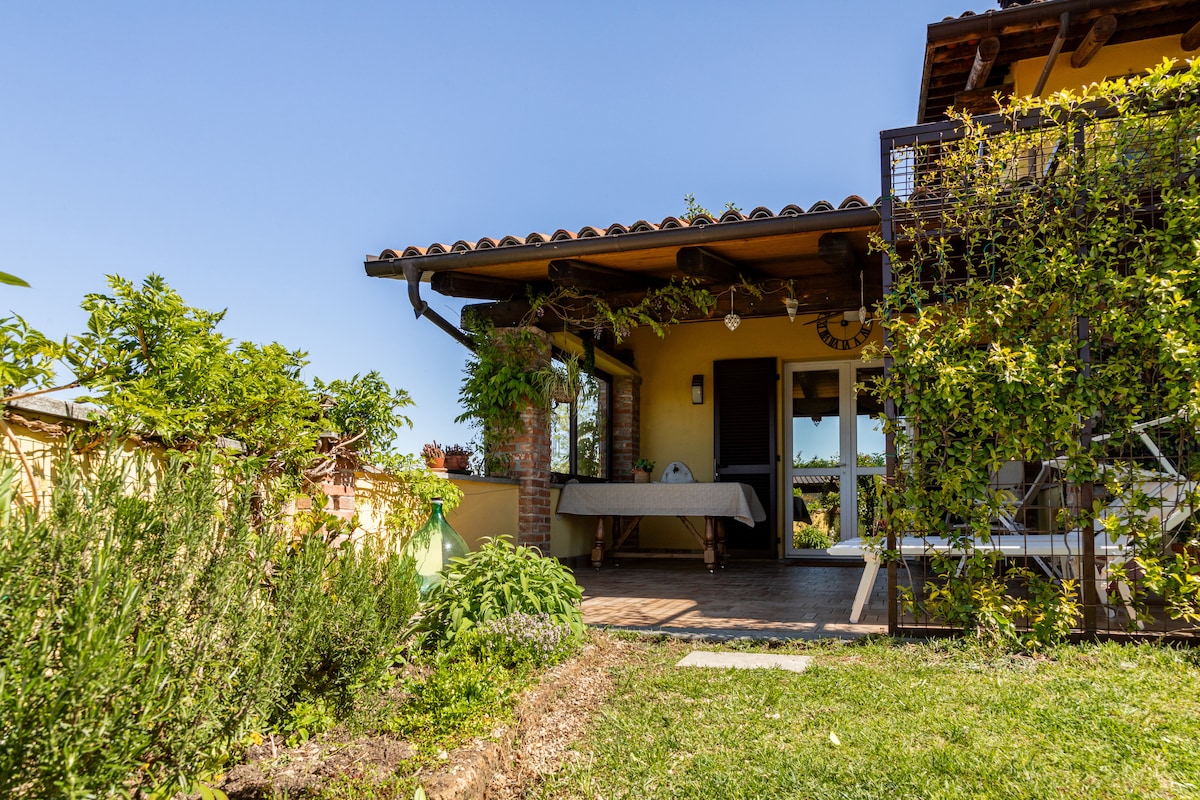 Encantador alojamiento independiente en dos plantas, recientemente renovado en una típica casa de campo en el corazón de las colinas de Roero, cerca de Alba. Posición dominante dentro de un gran jardín rodeado de viñedos y huertos. Habitación independiente en el piso superior con techo alto con vigas vistas y acogedora sala de estar en el piso inferior, con cocina equipada. Baño con ducha en la planta baja. Luminoso y amueblado con buen gusto, ideal para una familia o una pareja.