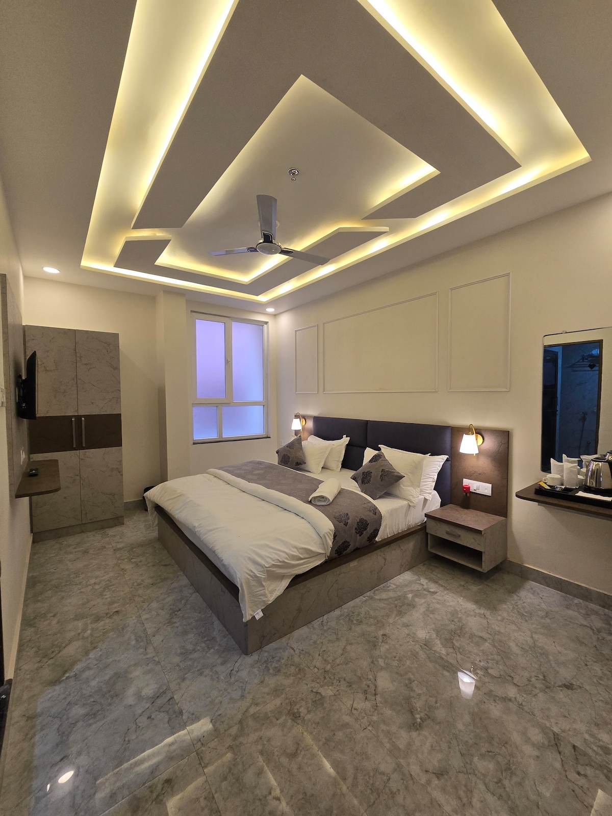 We designed the Royal Room to provide a comfortable and relaxing stay for our guests in Varanasi. Our prime location makes us one of the best hotels in Varanasi, especially for those looking to explore the city while enjoying a premium stay. Room Amenities: 1. Free Parking 2. Free Wi-Fi 3. Air-conditioning 4. Mini Fridge 5. Car Rental 6. Personal living space 7. LED TV for entertainment 8. Geyser for a refreshing hot shower 9. Electric Kettle for hot water 10. Storage cabinets