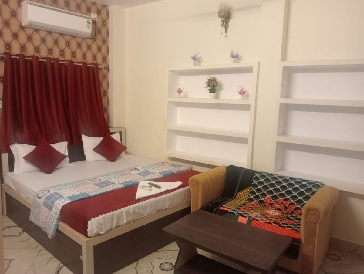 Habitación de lujo cerca del templo Kashi Vishwanath | Comodidad prémium y estadía tradicional Diseñada con interiores modernos y comodidades de primera calidad, la habitación cuenta con aire acondicionado, ropa de cama lujosa y un baño bien equipado. Los huéspedes pueden disfrutar de la vibrante energía de las calles del templo. Ideal para peregrinos, parejas y viajeros que buscan comodidad y clase, nuestro espacio garantiza serenidad a pocos pasos de lo divino. Reserva ahora para experimentar el alma de Varanasi envuelta en comodidad, lujo y tradición.