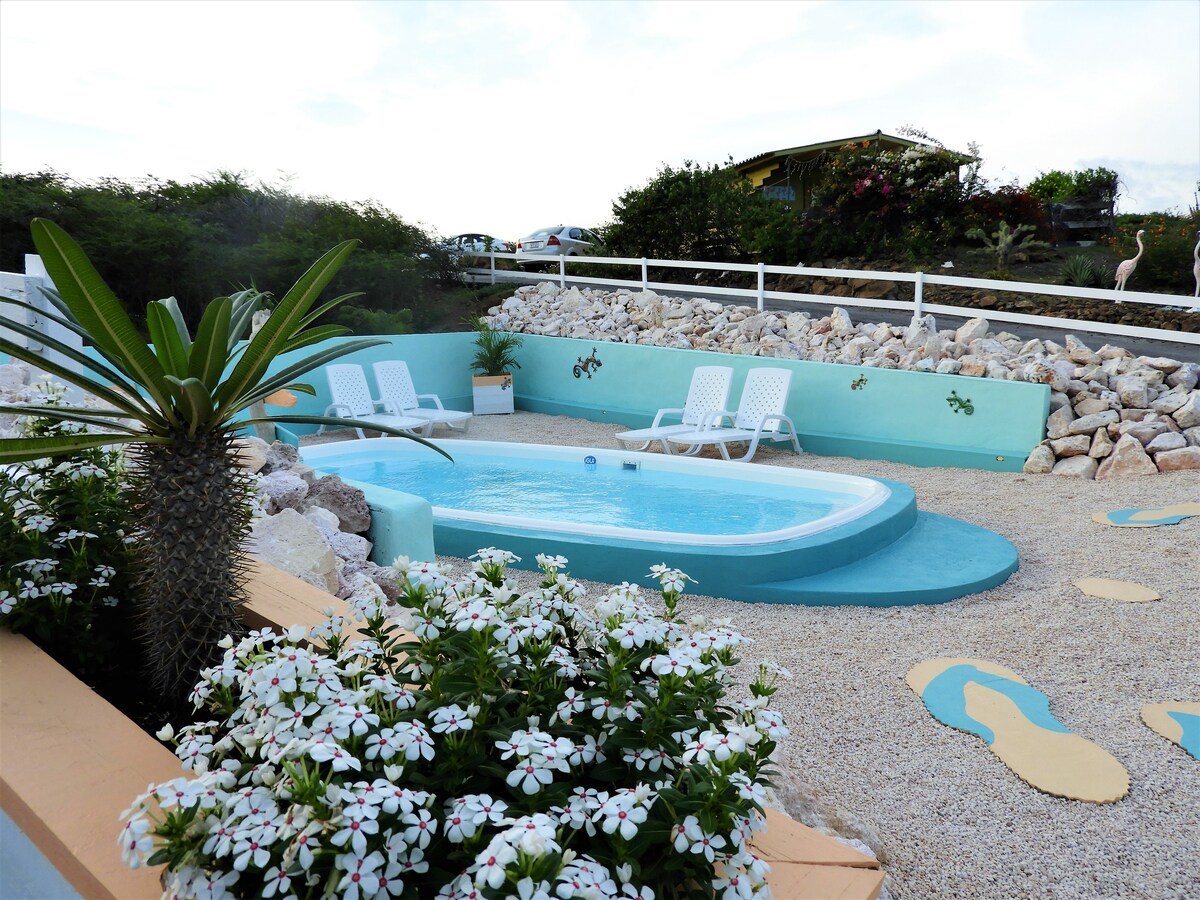 ¡Especialmente para ti, tenemos un eco-bungalow cómodo, independiente y económico con unas vistas increíbles! Este bungalow tiene 1 dormitorio y viene con mucha privacidad, un gran jacuzzi privado, sillas relajantes, piscina y está a solo 5 minutos de las playas más bonitas de Curazao. El bungalow está rodeado de naturaleza, entre las muchas hermosas flores tropicales y pájaros de colores brillantes. Disfrutando de una vista panorámica a las salinas, colinas y mar.