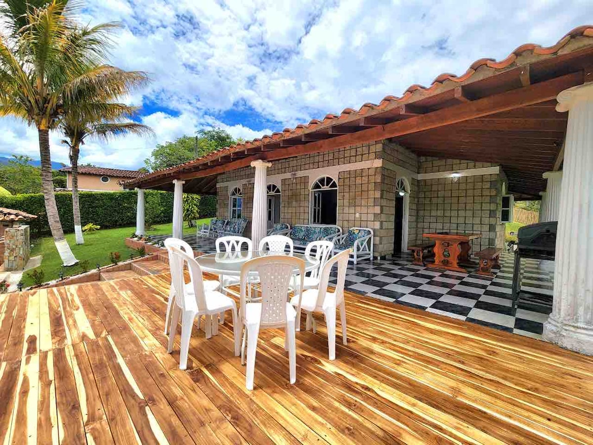 Una acogedora casa con una amplia terraza exterior con vista a la piscina y las montañas. Se pueden acomodar de 8 a 10 personas. Amplias zonas verdes. Se recomienda visitar una cascada con charco a 20 minutos caminando. Se ofrece servicio de climatización de la piscina por un costo adicional que dependerá del tiempo de uso.