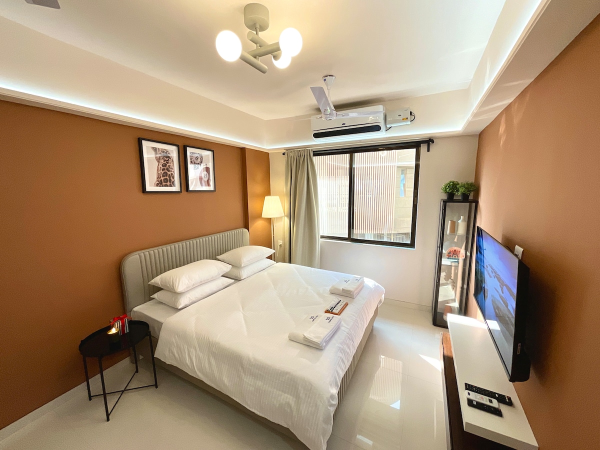 Luxurious Yellow Block Studio at the foothills of Ulhas Valley with a pvt. balcony and panoramic mountain views from the top floor. A peaceful getaway to unwind. Fully loaded with WiFi, JBL 2.1 Home Theatre, BT Music System, Full-HD LED TV. A stylish bathroom with toiletries. Pantry with tea/coffee supplies, RO water, Microwave, Induction Hob, Fridge & s/w Toaster and a comfortable study space. Common amenities on-site like swimming pool, games room, gym, mini theatre, cycling and restaurant.