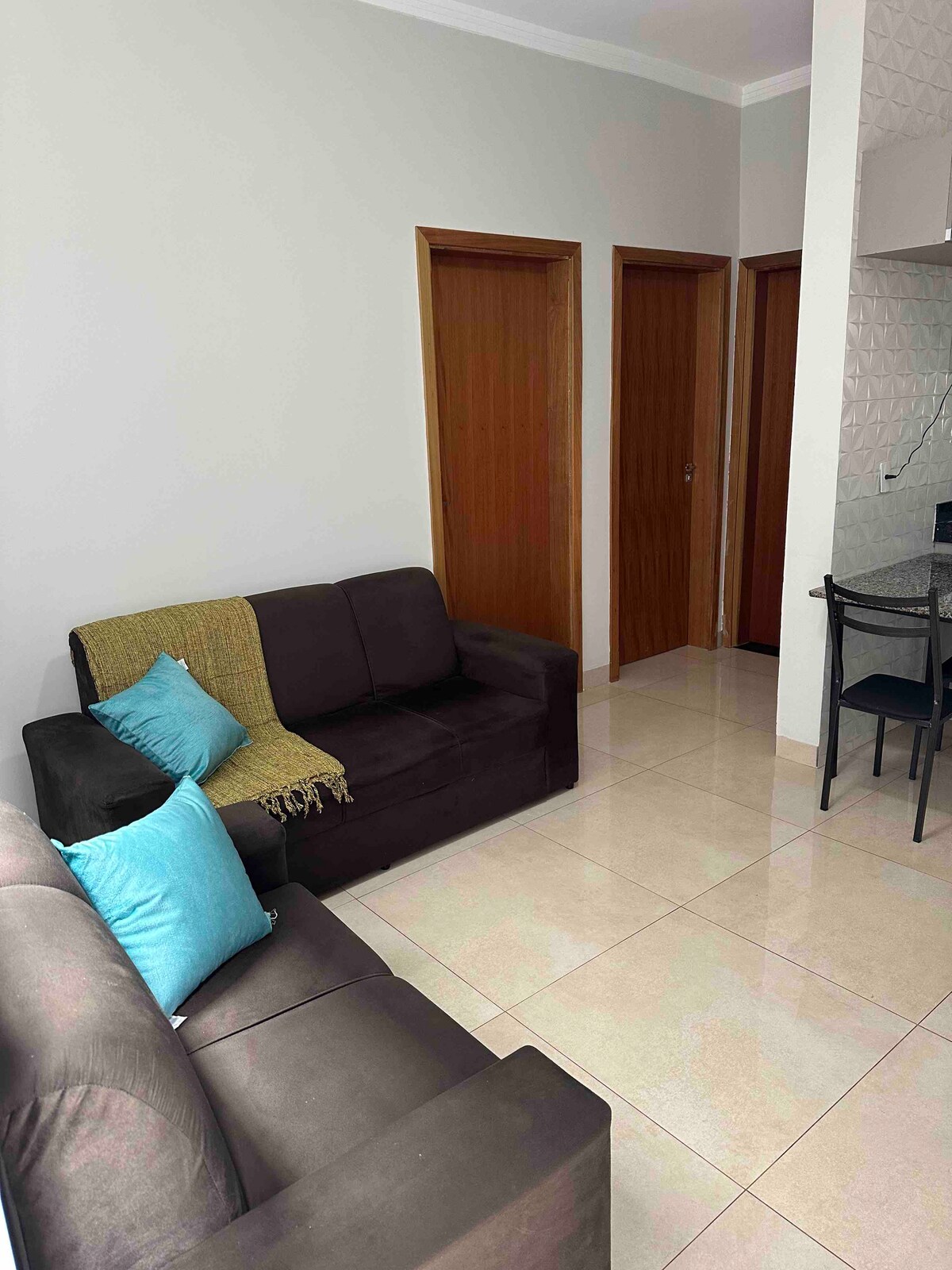 Um apartamento extremamente sofisticado e confortável em um condominio fechado. Local novo e todo mobiliado com sofá retrátil; Smart TV; WiFi; cozinha e área de serviço completa; 2 quartos sendo 1 com cama box de casal e ar condicionado e 1 com local para home office e espaço para colchão de casal no chão; 1 banheiro; iluminação personalizada em todo o esáço e todo o conforto e segurança de um condomínio fechado com uma vaga coberta, piscina, academia, conveniência 24h, etc.