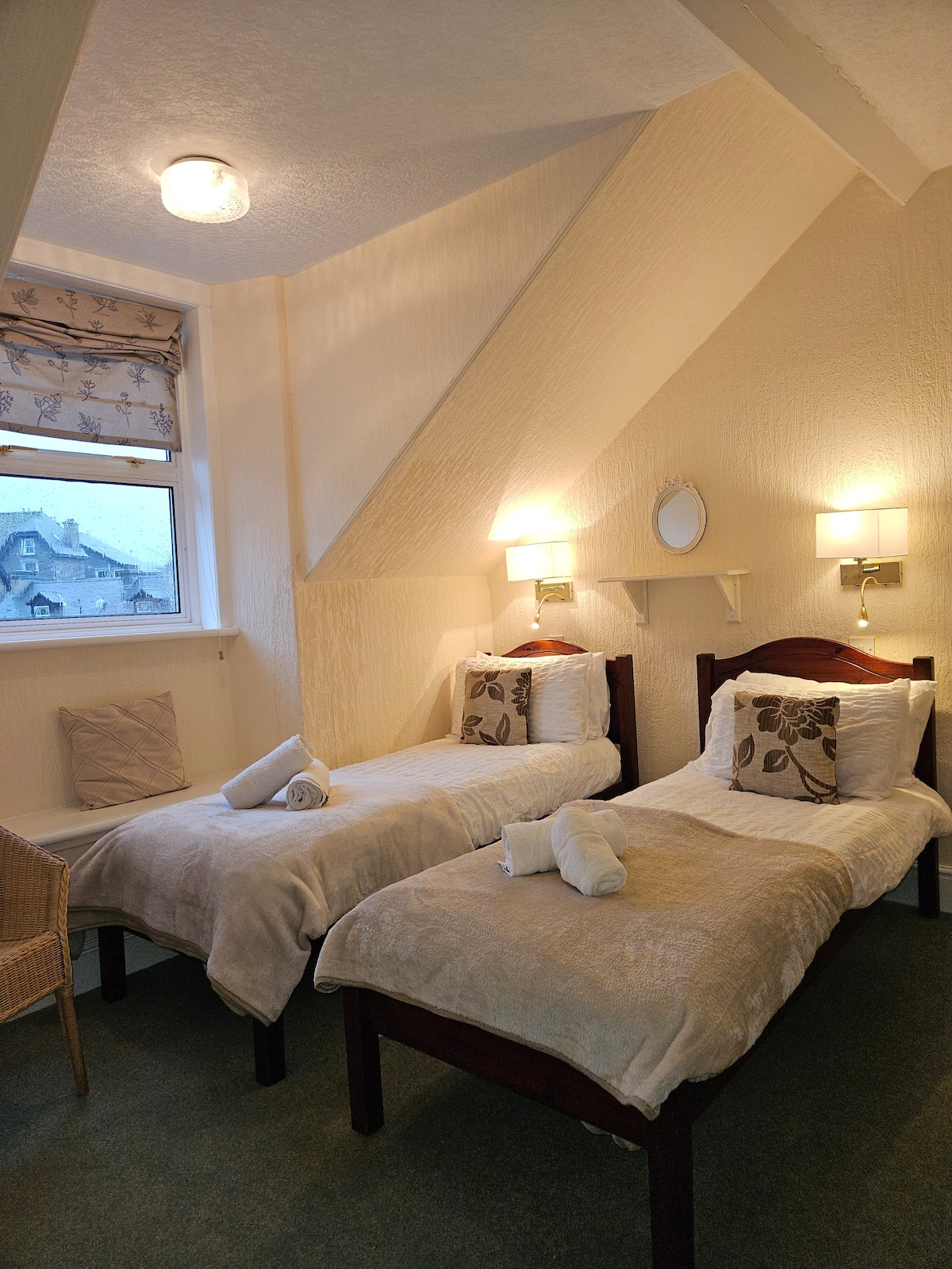Encontrarás nuestras acogedoras habitaciones de doble casa de campo dispuestas en dos plantas en una llamativa residencia victoriana independiente frente al edificio de recepción principal. Tenemos dos en el segundo piso y uno en el tercer piso.