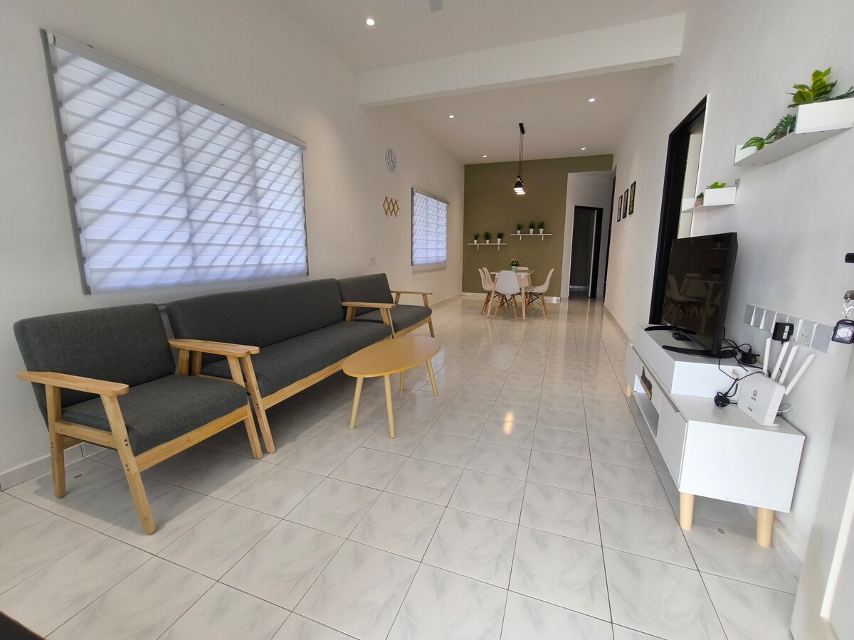 Bienvenidos 4 dormitorios, 4 baños en Batu Pahat (zona central) Adecuado para viajes familiares y en grupos pequeños de hasta 15 personas. (6 camas tamaño queen + 3 camas super individuales) Todas las habitaciones y la casa están totalmente climatizadas y equipadas con toallas, wifi, TV Android, nevera, lavadora, cocina de inducción y vajilla. Se proporcionan toallas y champú de artículos esenciales. La tabla de planchar , la plancha y el secador de pelo están listos para ayudarte. Convenientemente situado cerca de Aeonbig, Old Street, BP Mall y D Garden, el viaje está a solo 5 minutos de distancia.