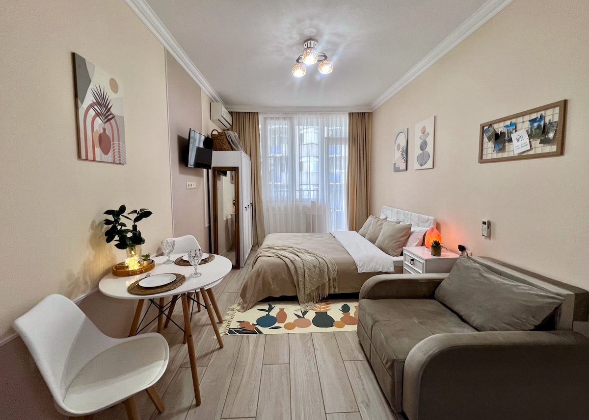 Sunny, bright, stylish, place filled up with different colors, with a great view to Black Sea, equipped with all facilities. Just few minutes to sea shore by feet. Shopping malls, dolphinarium, great choice of restaurants. Smart TV with cable.