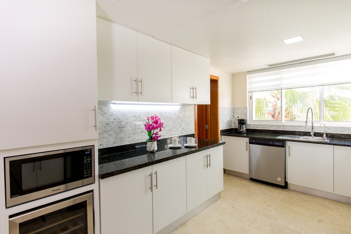 Escápate a esta villa premium en Doral Village, a 1 minuto de Downtown Punta Cana. Cuenta con 3 dormitorios, 3 baños completos, diseño moderno y terraza privada con picuzzi. Disfruta estación de bienvenida con café dominicano, leche y agua fría. Incluye aceite de oliva española, tés, chocolates y doble almohada por huésped. Amenities premium: gel Dr Teal’s y champú y acondicionador L’Oréal. Ubicación ideal cerca de restaurantes, supermercados y cines.