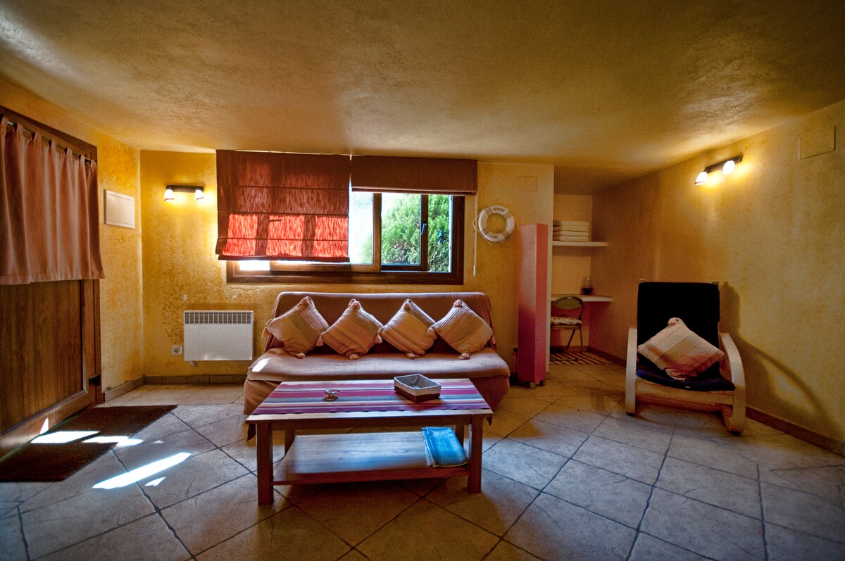 Hosted by a 10-time Superhost with consistently 5★ guest experiences. This spacious studio apartment is located in a very quiet residential area of Begur, just a 20-minute walk from the town centre. The studio features a fully equipped kitchen and a spacious bathroom with a large shower, WC and washbasin. The sleeping area includes a double bed with direct access to a private chill-out lounge area. There is also an indoor lounge with a comfortable sofa, two coffee tables and soft lighting.