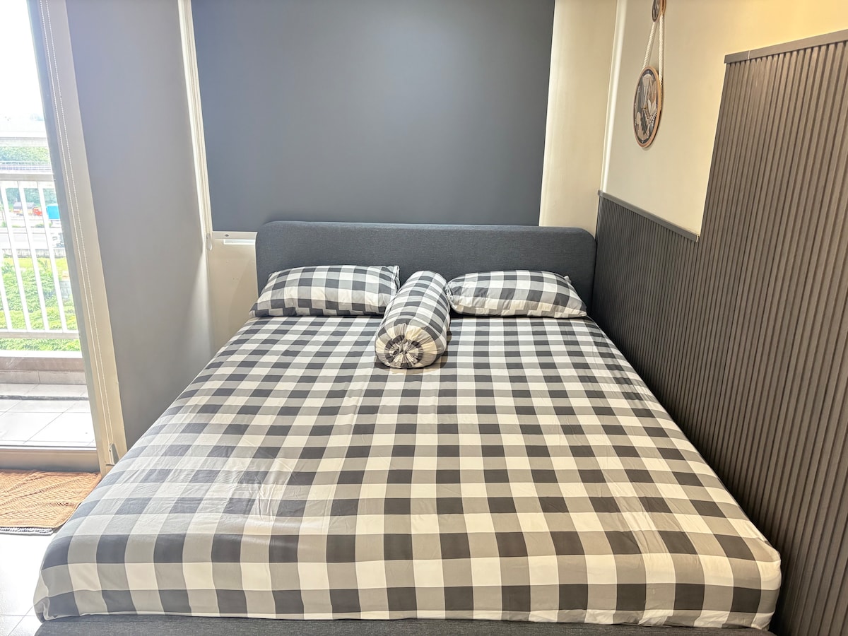 Stay comfort in a warm studio room with nice city view and the lagoon beside. Completed with kitchen set, queen bed size and working space with unlimited wifi access, your stay will feel like home. Enjoy various facilities: swimming pool, kids play area, gym, shopping mall, cinema and various restaurants. For health and safety reason to all of the guest, this apartement is cleaned with antiseptic and desinfectant before check-in.