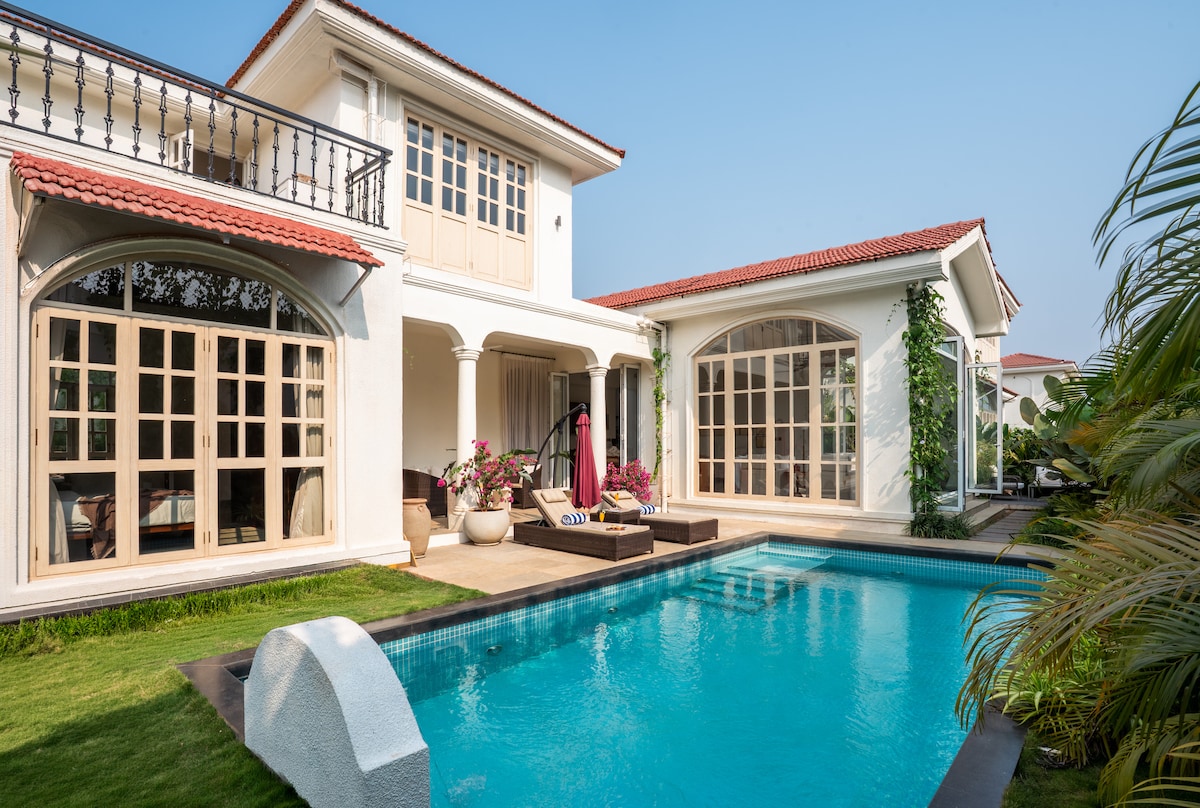 ¡Esta villa de 3 dormitorios "IKSHAA ®" con piscina privada es una de las villas más aisladas y románticas que combinan lujo con la belleza rústica! Es una villa independiente que personifica la exclusividad y la total privacidad. La vegetación y el bosque de los alrededores son encantadores y, sin embargo, está a solo 20 minutos en auto del aeropuerto de Goa o de las playas más cercanas al sur de Goa. ¡No tendrás problemas para sentirte como en casa aquí en IKSHAA® en Loutulim!