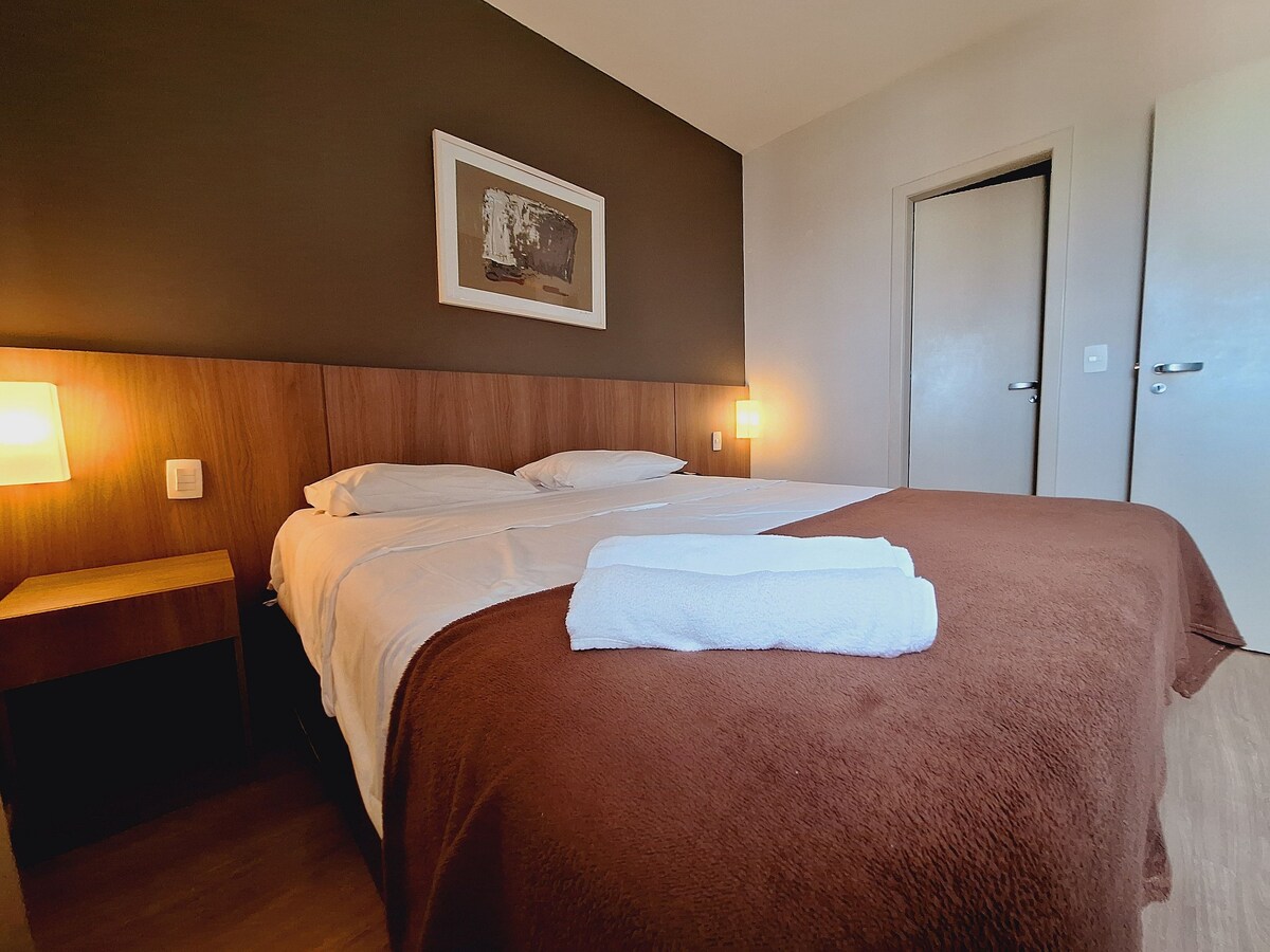 Aquí, todo es fácil y práctico, ¡desde el principio hasta el final de tu estancia! La propiedad estaba muy bien preparada y diseñada para proporcionar la mejor experiencia posible. Un dormitorio grande con balcón, que cuenta con una cama matrimonial, que proporciona una sensación de entero. Es un buen lugar para renovar la energía. La ropa de cama, 2 almohadas y una manta doble están incluidos en la reservación. Todo lo necesario para una buena estadía