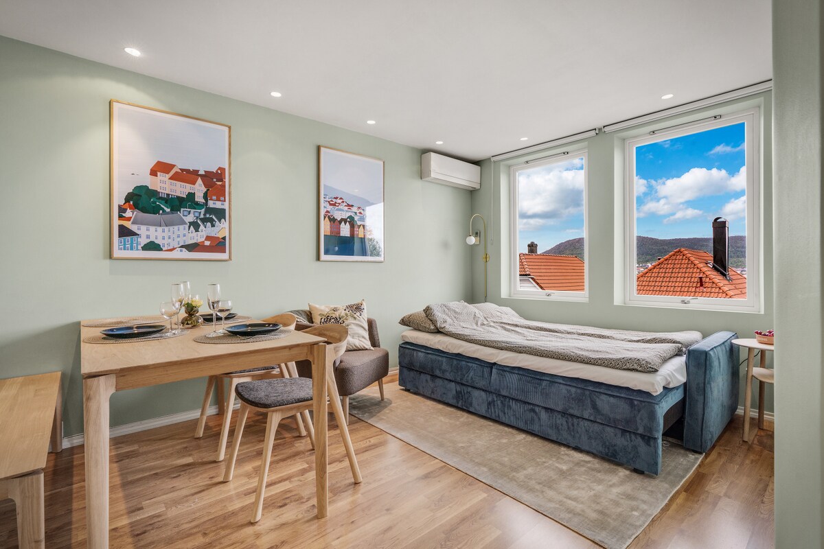 Ubicado en el encantador barrio de Bergen, este acogedor apartamento estudio ofrece la combinación perfecta de comodidad de la ciudad y la belleza natural. Situado a un tiro de piedra de la primera parada del tren de la montaña Fløibanen y de la histórica estación de bomberos de Skansen, cuenta con una ubicación única en el corazón de Bergen. Los huéspedes tienen el alojamiento entero para ellos. Un visitante describió la zona como viviendo en un set de cine.