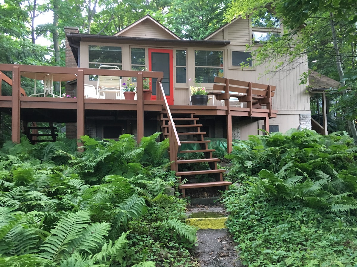 Casa entera en el lago con mucho espacio para dormir para familias. Cuatro dormitorios y siete camas (contando dos camas nido). La casa fue recientemente renovada para añadir un solárium y transformar el primer piso en un concepto abierto con una cocina espaciosa y sala de estar. Hay dos juegos de lavadora/secadora en el sótano para acomodar a grupos grandes. Cruza la calle hasta Crystal Lake, pasea dos manzanas hasta el centro de la ciudad para comer o pasa el rato junto al arroyo y escucha las ranas a la luz de la fogata.